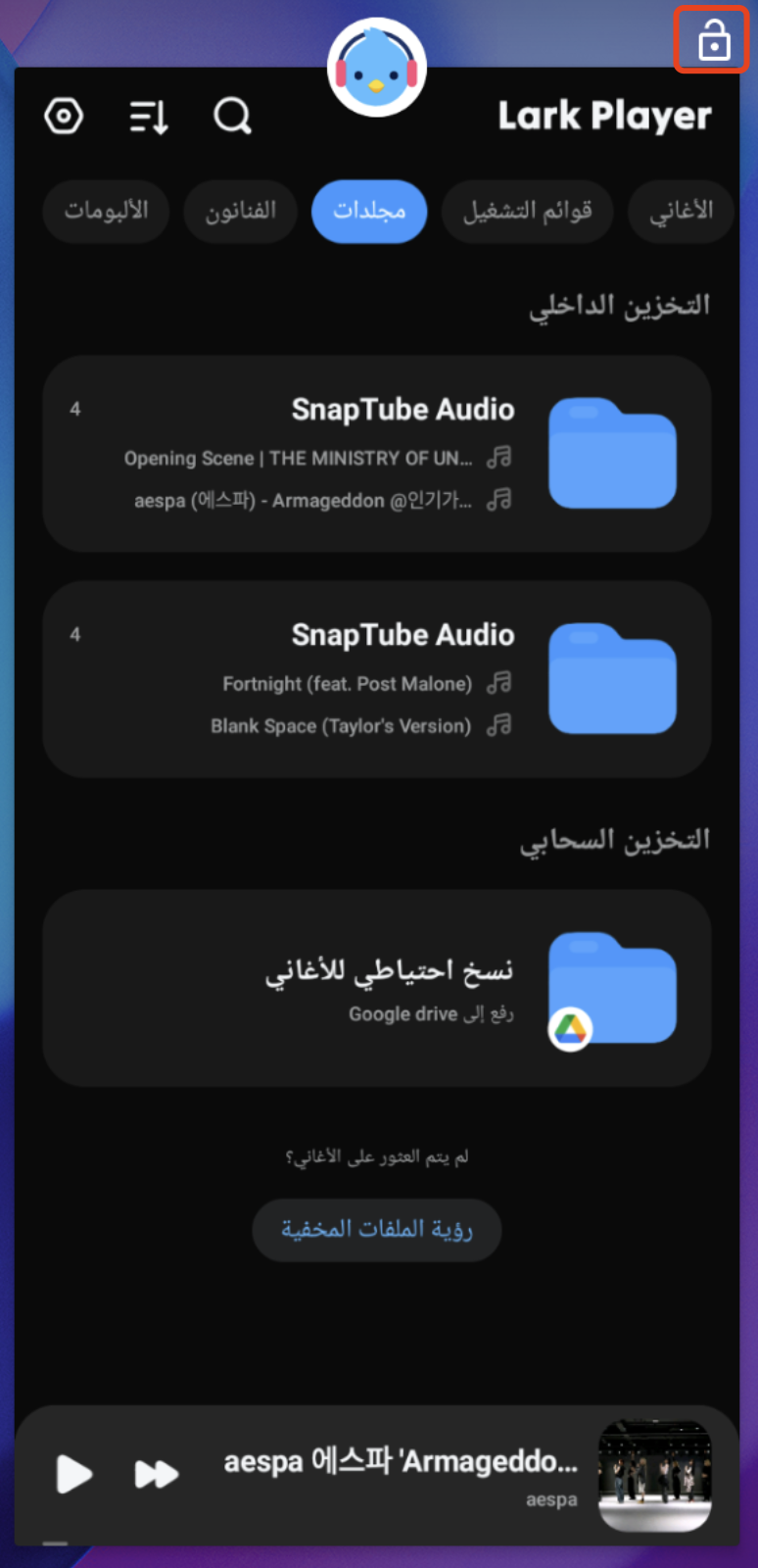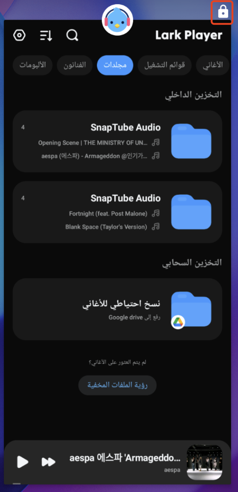 لضمان تشغيل الموسيقى بسلاسة في الخلفية، يرجى قفل تطبيق Lark Player. سيمنع ذلك النظام من إغلاقه تلقائيًا لتوفير البطارية أو الذاكرة.
