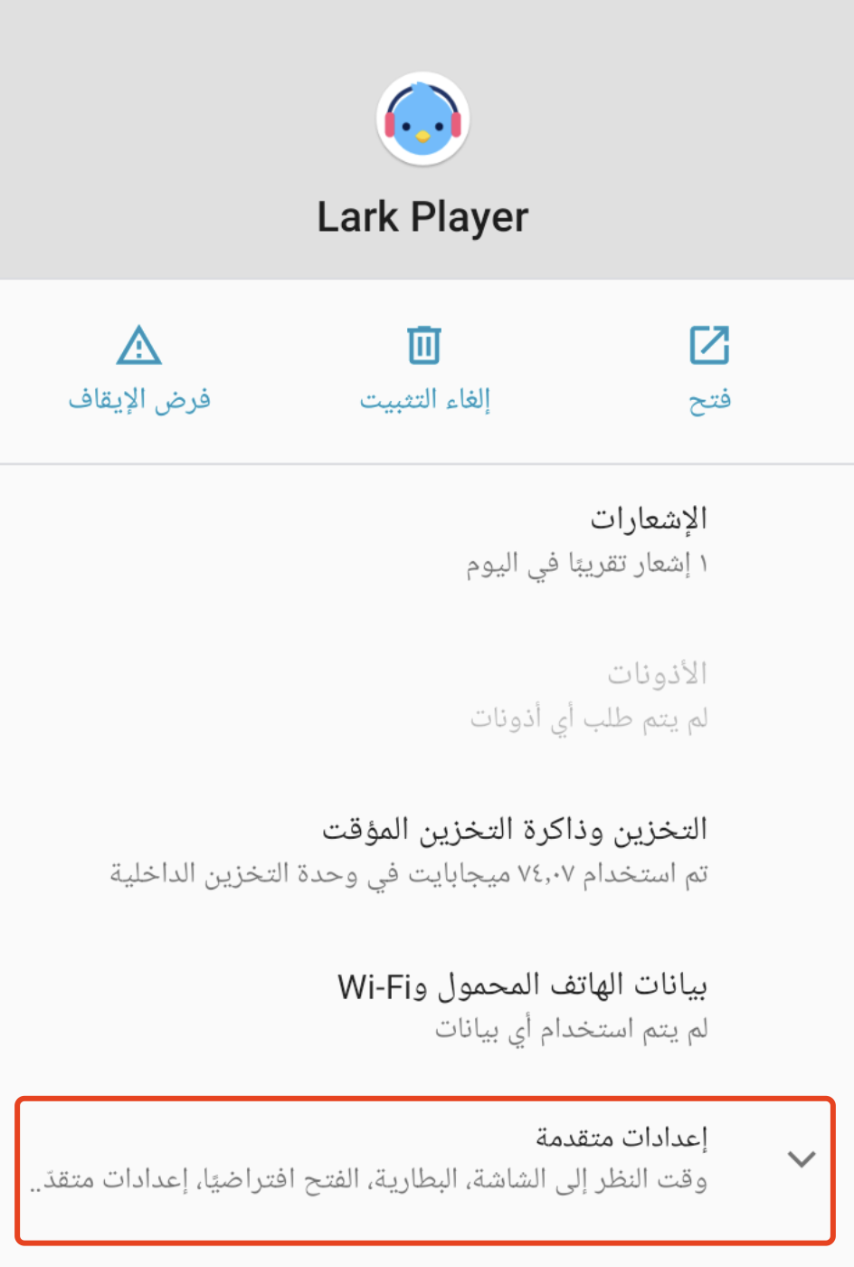 - اضغط مع الاستمرار على أيقونة Lark Player، ثم اضغط على أيقونة [i] في الزاوية العليا اليسرى لفتح صفحة معلومات التطبيق