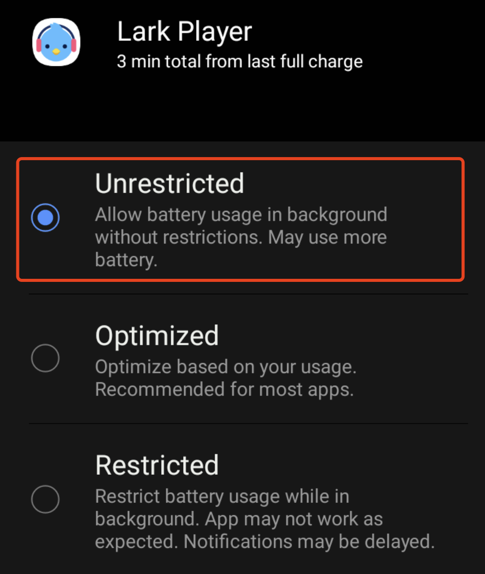 4. Choose Unrestricted (or Allow background activity / Don’t optimize) to disable battery optimization for Lark Player. This will prevent the system from limiting the app’s background activity and help maintain smoother playback.