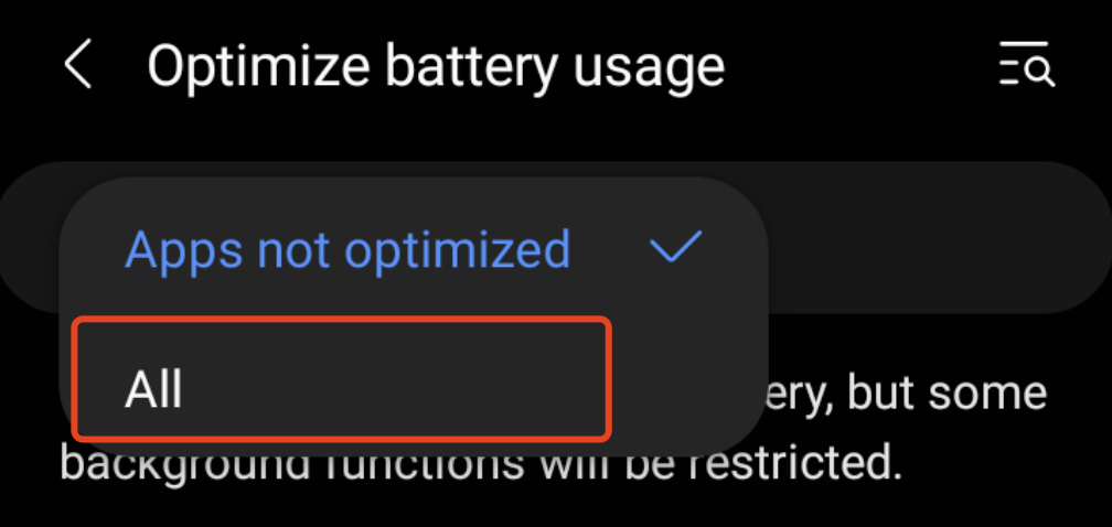 4. Change the view to All Apps (instead of “Not optimized” or “Apps not optimized”).