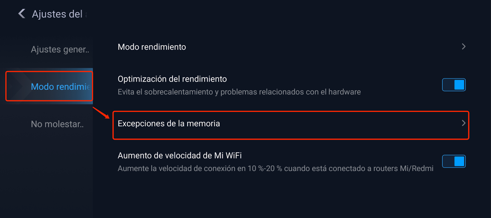 4. Selecciona Modo rendimiento y luego toca Excepciones de la memoria