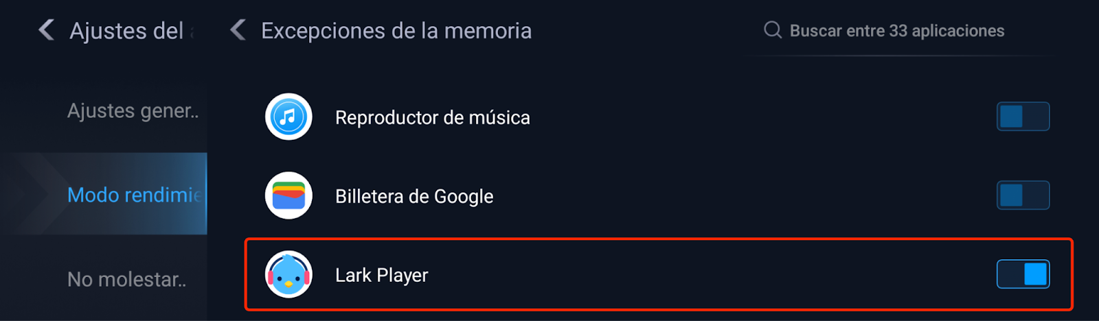 5. Busca Lark Player en la lista y activa el interruptor