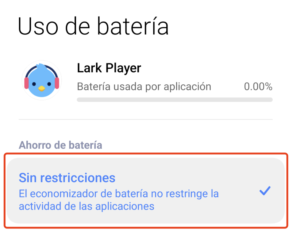 Para que Lark Player funcione sin interrupciones causadas por el modo de ahorro de batería, configúralo en "Sin restricciones". Esto evita que el sistema limite la actividad en segundo plano de la aplicación, permitiendo una reproducción continua de música.