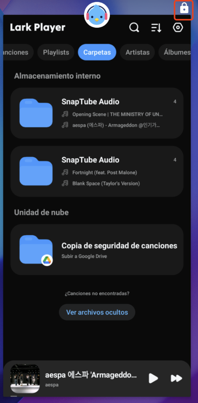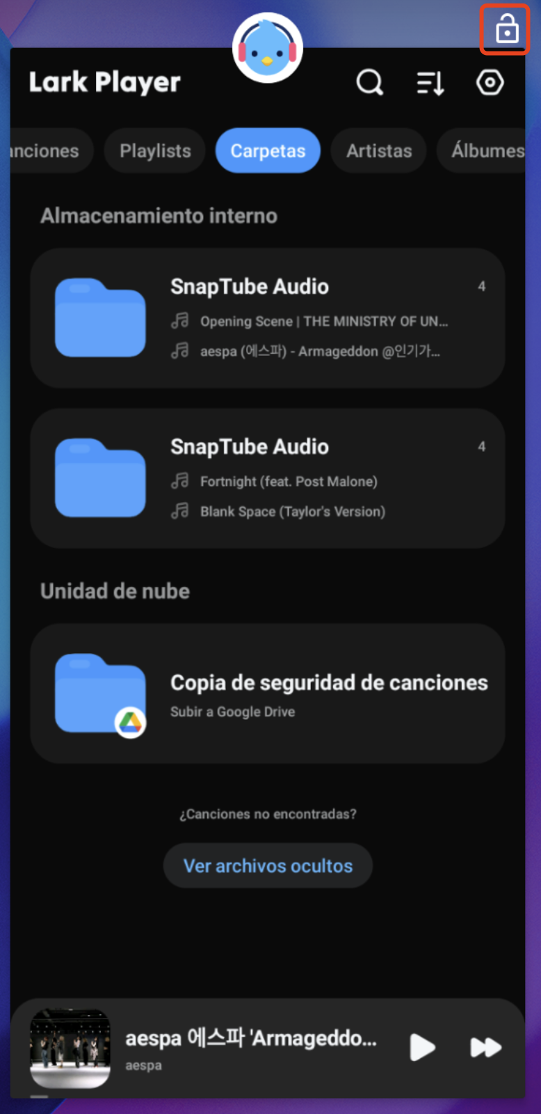 2. Cuando vea el icono de candado en la esquina superior derecha, significa que no está bloqueado. Mantenga presionada la pantalla de Lark Player, luego deslícela hacia abajo para bloquearla