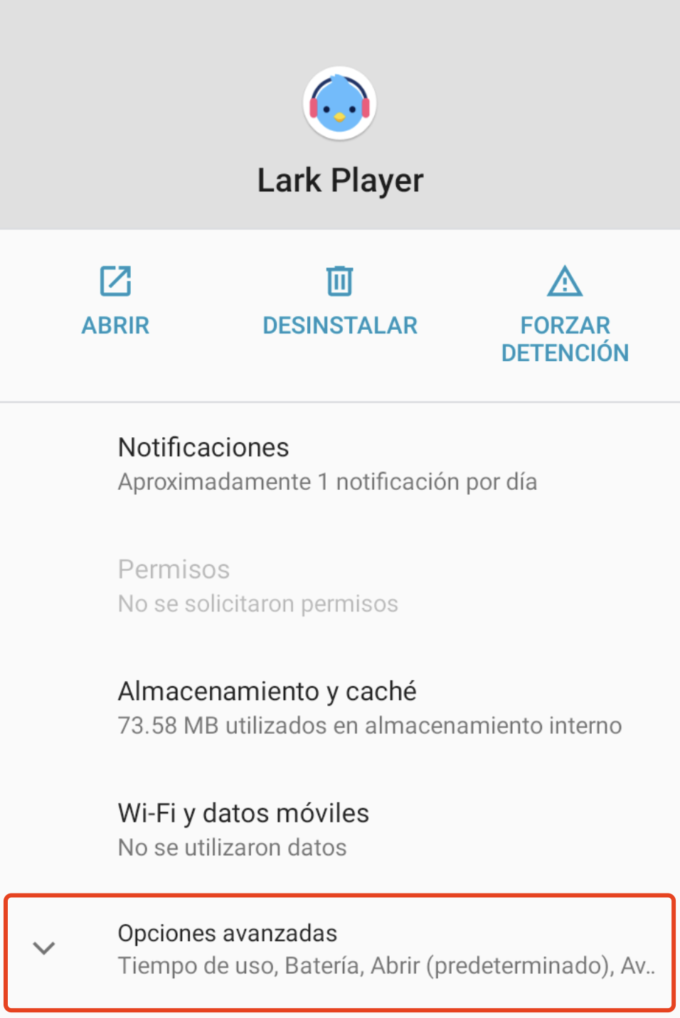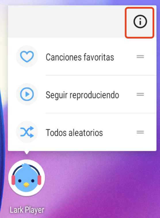1. Mantén presionada la íconoa de Lark Player, luego toca el icono de [i] en la esquina superior derecha para abrir la página de información de la aplicación