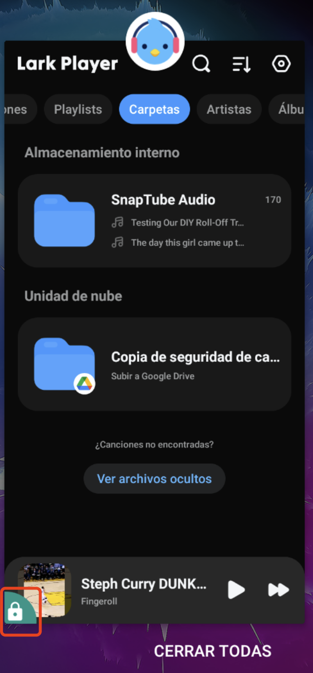 4. El icono de bloqueo aparecerá en la parte inferior izquierda de Lark Player, indicando que se ha bloqueado correctamente
