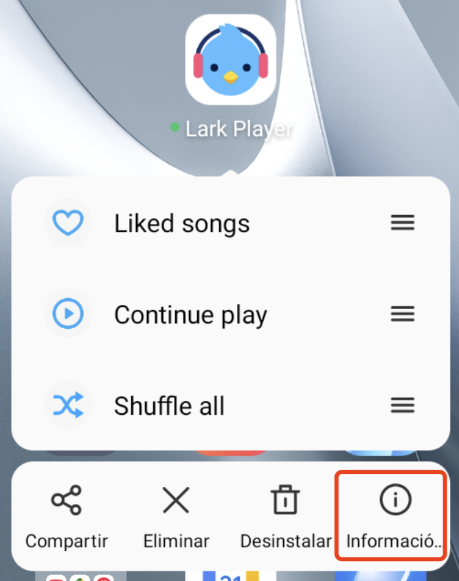 1. Mantén presionado el ícono de Lark Player en tu pantalla de inicio. Toca en Información de la aplicación.