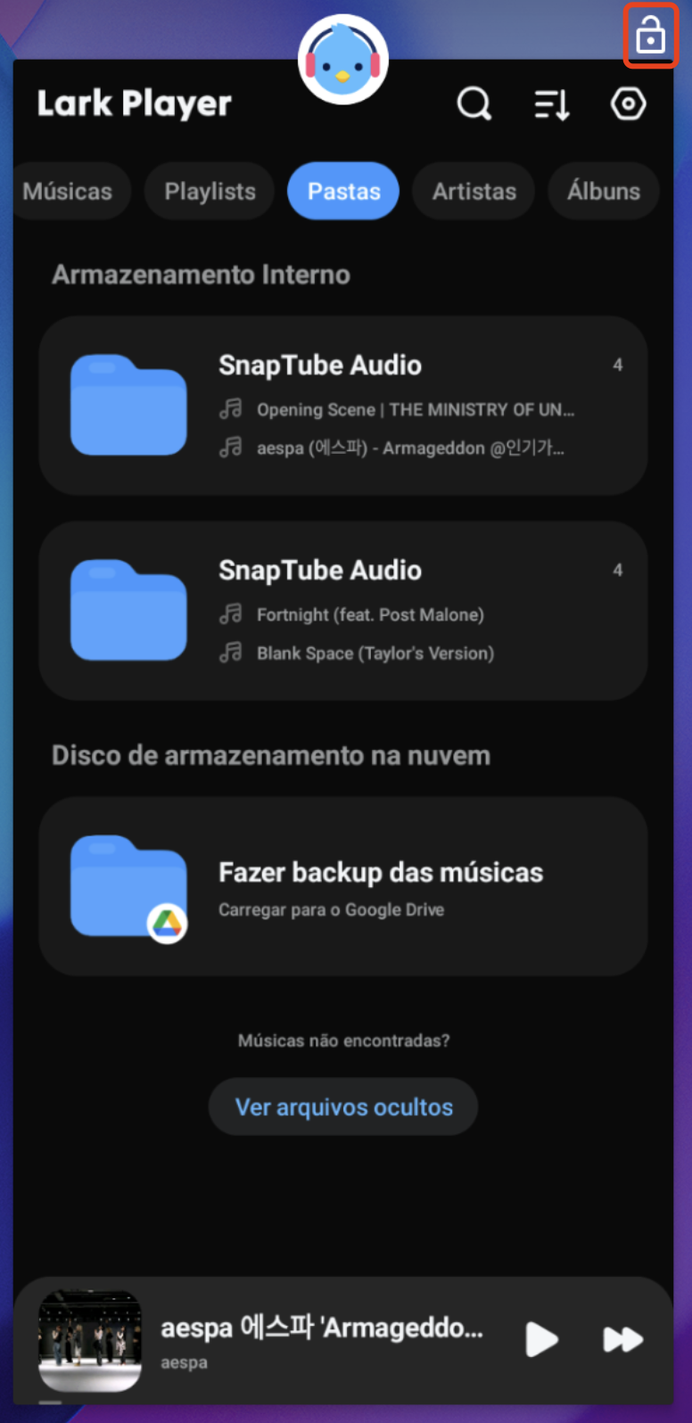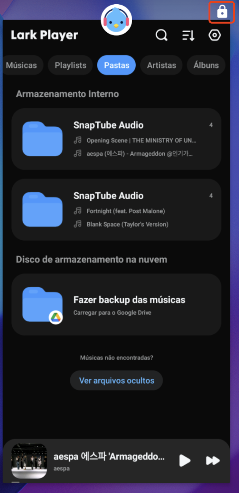 2. Quando você ver o ícone de cadeado no canto superior direito, significa que o aplicativo não está bloqueado. Pressione e segure a tela do Lark Player, então deslize para baixo para bloqueá-lo