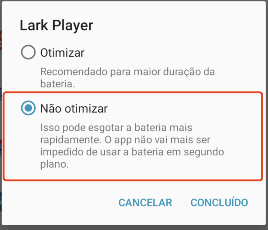 Para garantir que o Lark Player continue tocando música sem interrupções devido ao modo de economia de bateria, defina como "Não otimizar". Isso impede que o sistema limite a atividade em segundo plano do aplicativo.