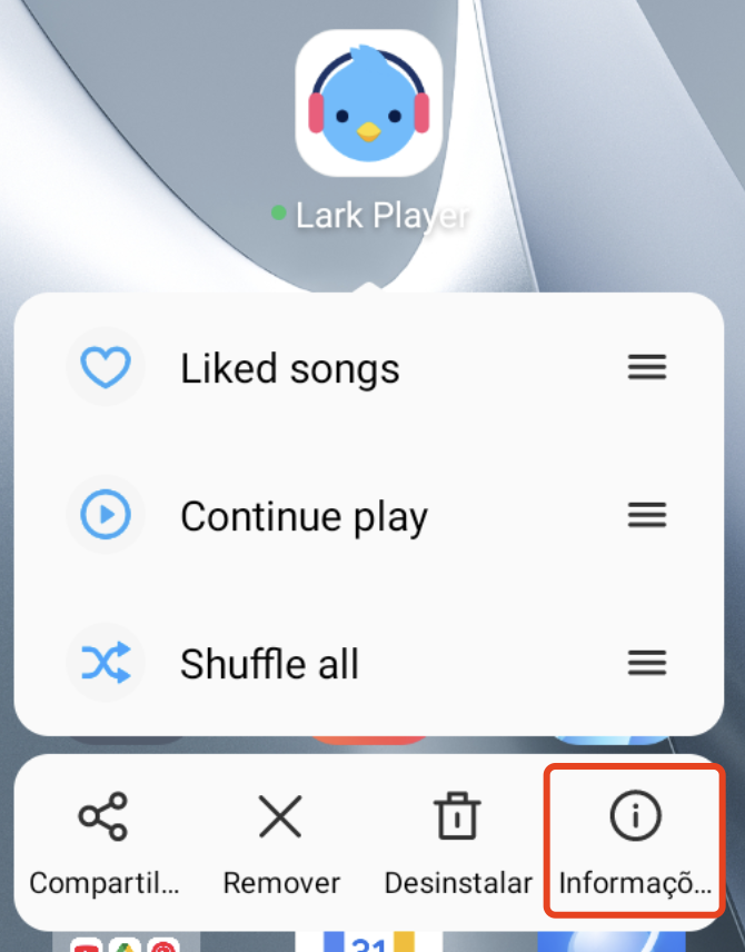 1. Pressione e segure o ícone do Lark Player na tela inicial. Toque em Informações do aplicativo.