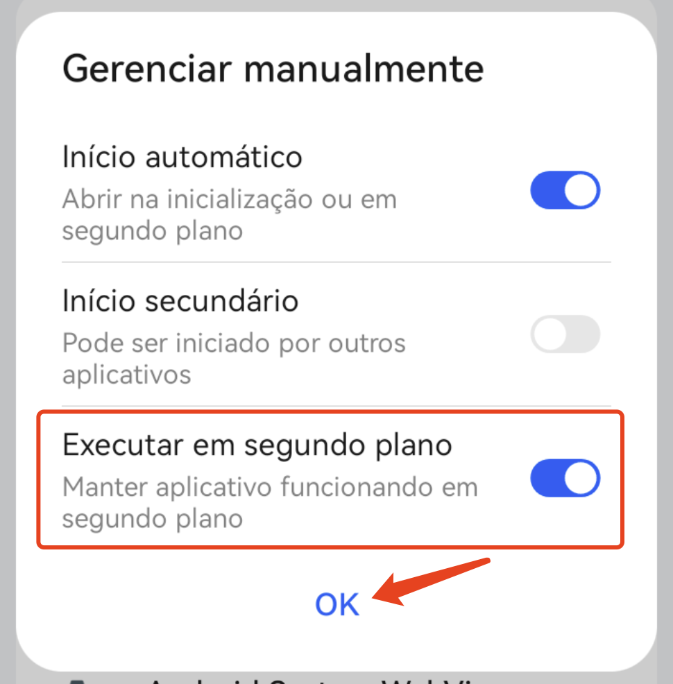 4. Nas Gerenciar manualmente, certifique-se de que a opção Executar em segundo plano esteja ativada.